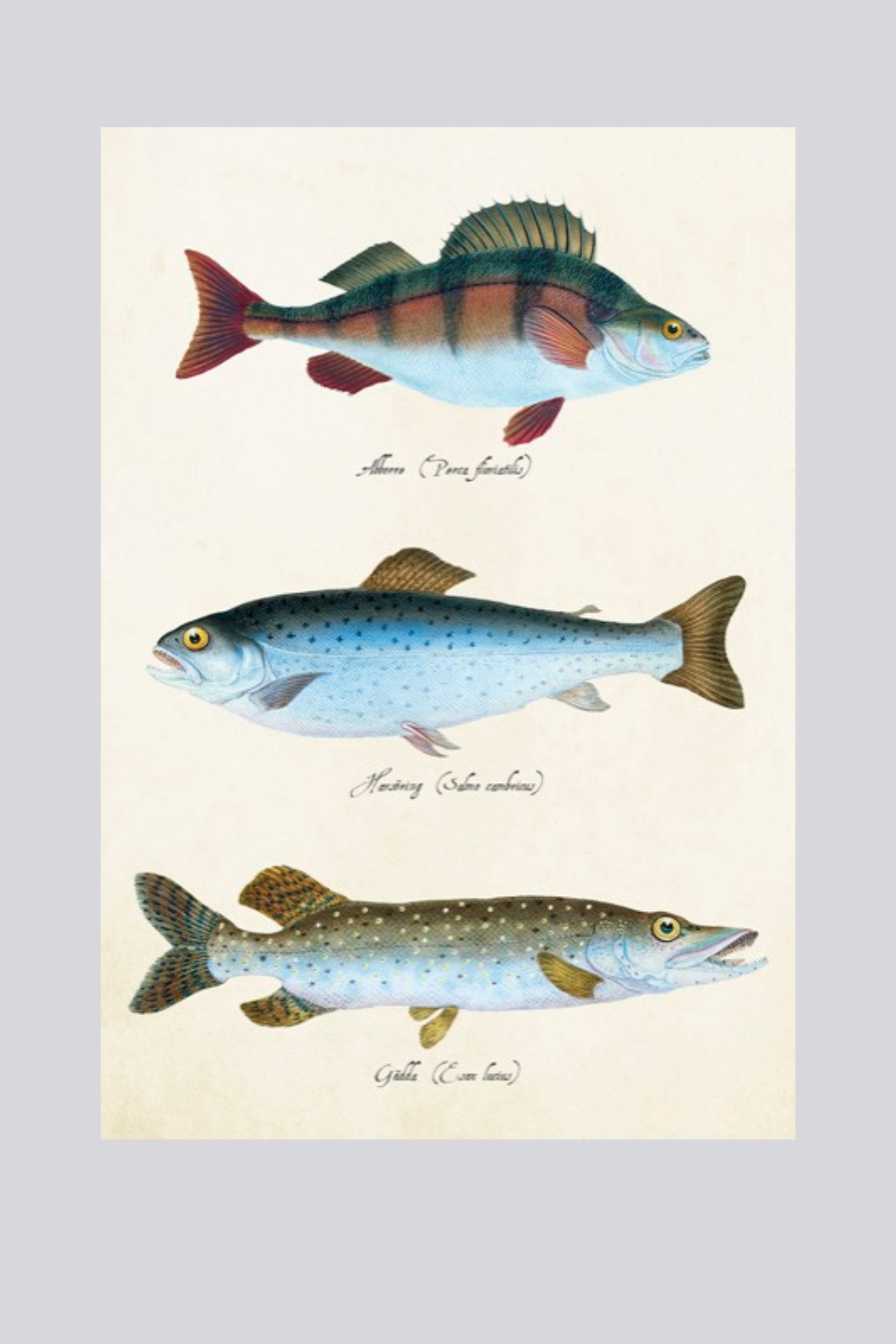 Ett elegant dubbelt vykort med ett detaljrikt fiskmotiv som ger ett stillsamt och tidlöst uttryck. Kortet passar fint för personliga hälsningar, gratulationer eller som ett litet kort att ge bort tillsammans med en present.