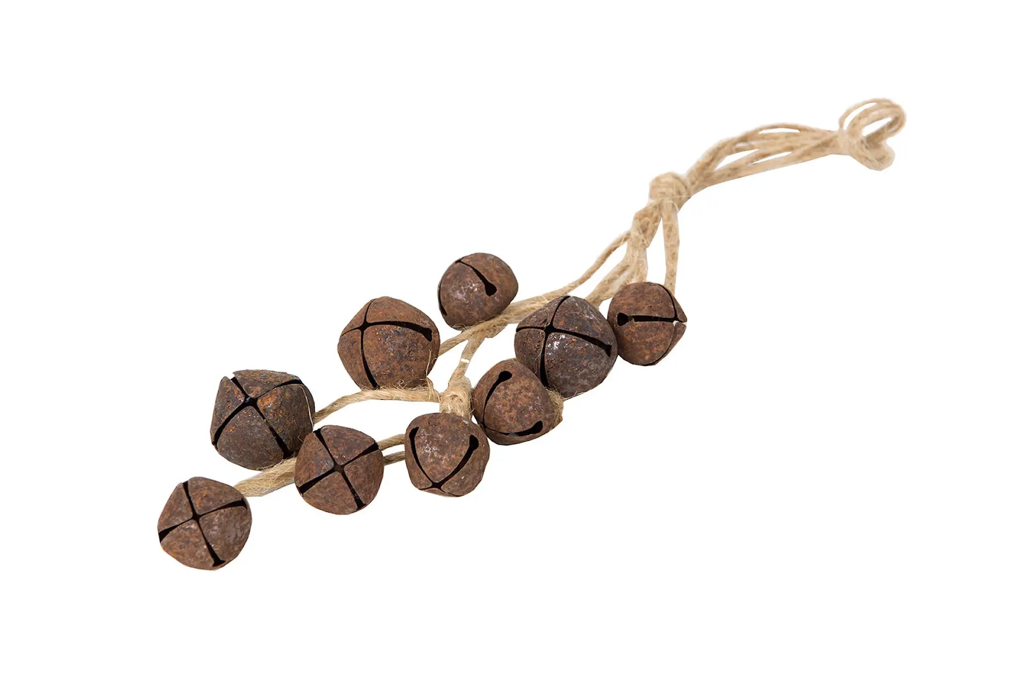 Ett vackert knippe med bjällror som blir en stämningsfull detalj i en krans, ett blomsterarrangemang eller som dekoration på egen hand. Tillverkade av metall med rustik känsla. Längd ca 25 cm. Passar perfekt till julens naturliga och lantliga dekorationer.
