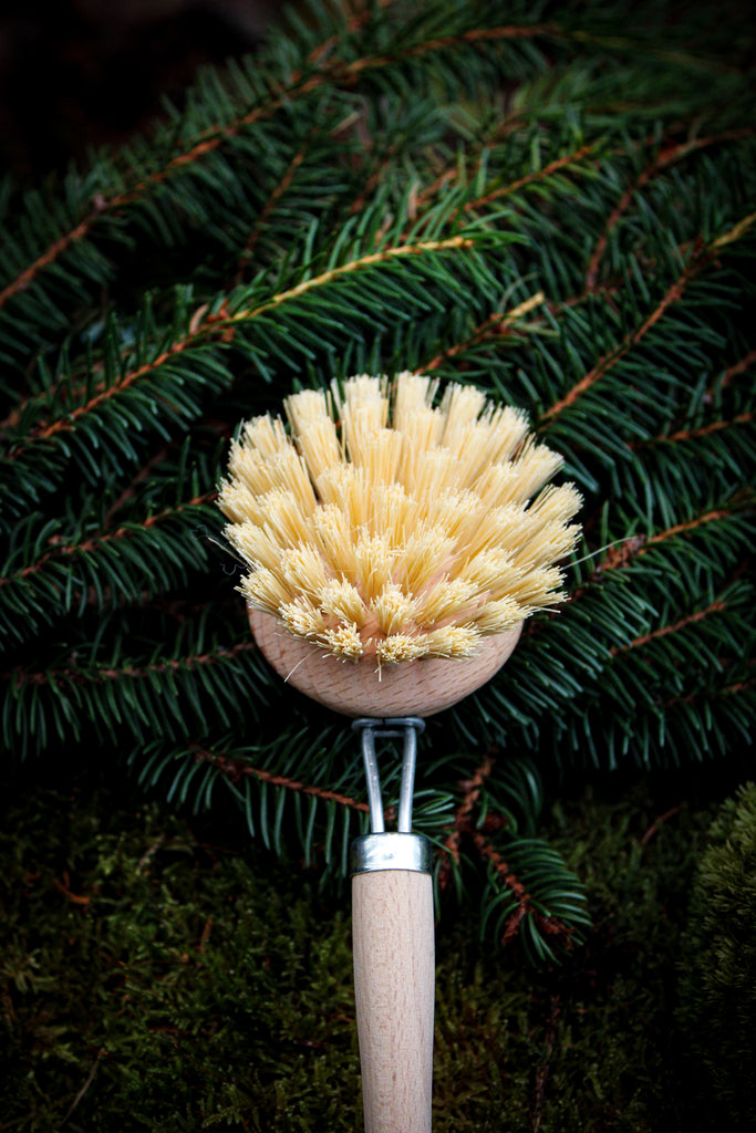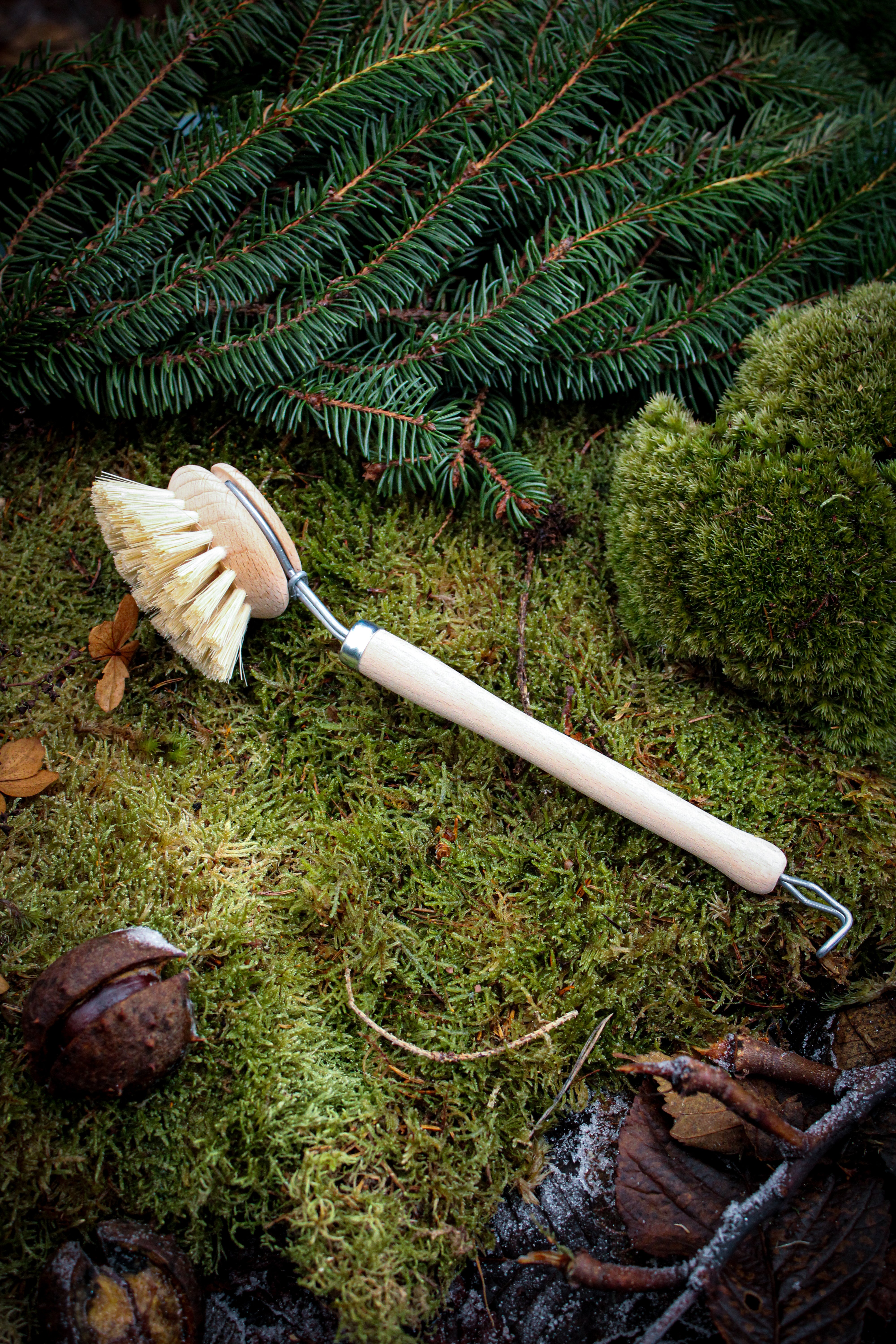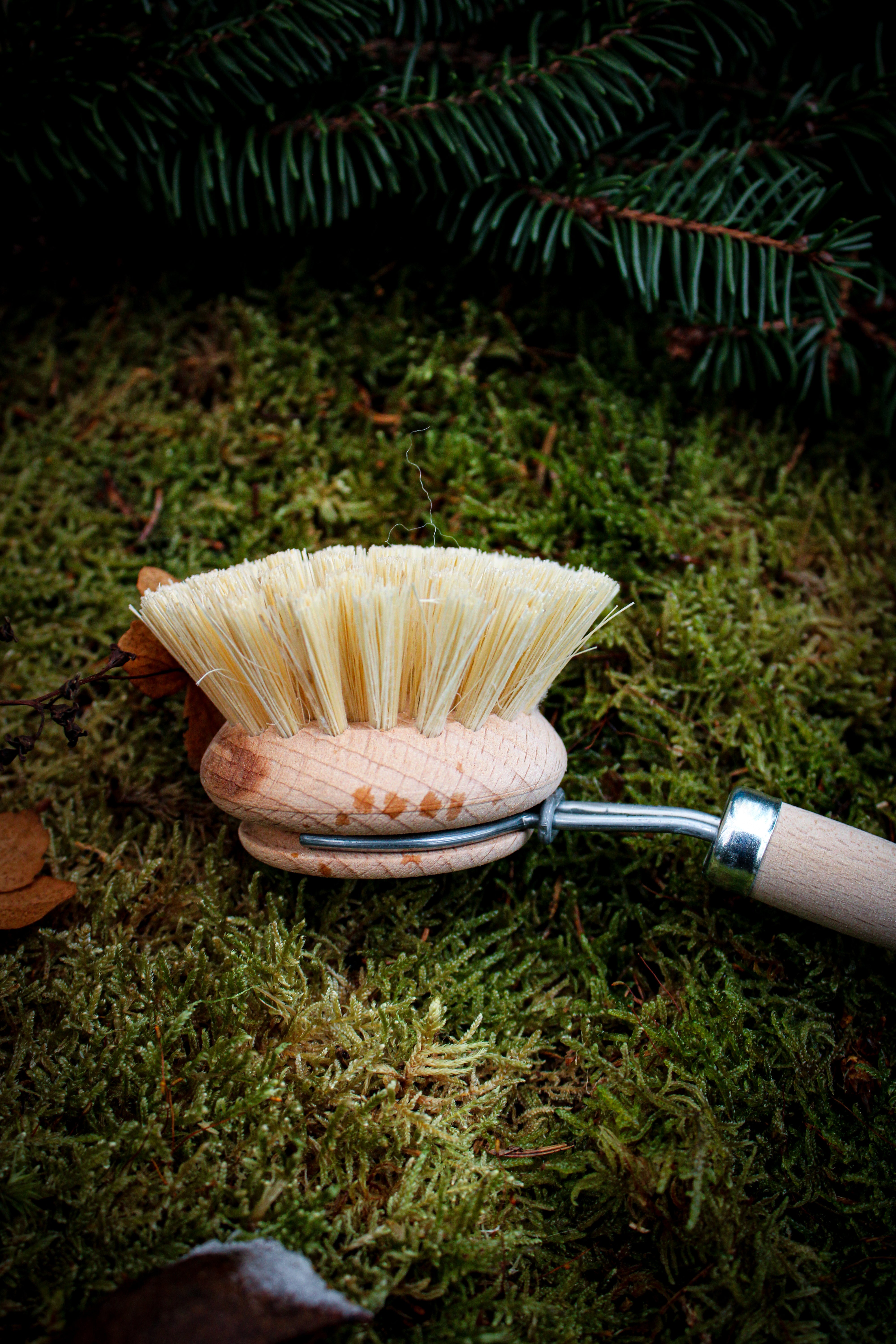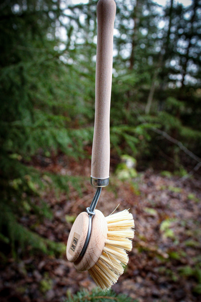Handgjord klassisk diskborste av FSC-märkt bokträ med borst av vegetabilisk fiber. Kroken på handtagets skaft gör det enkelt att hänga upp på en krok i köket när du är klar med disken. Låt gärna borsten torka hängandes. Diskborsthuvudet kan bytas ut mot ett nytt.